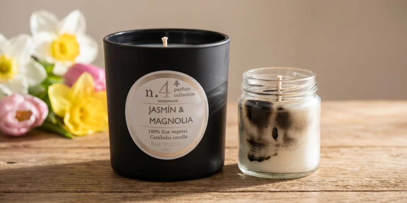 Cómo quema. Una vela de cera vegetal de calidad produce muy poco o ningún humo negro. Si humea mucho desde el principio, mala señal.